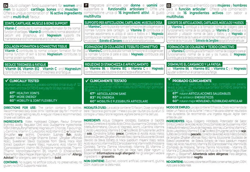 Formula sa de peptide de colagen bioactive, acid hialuronic, glucozamina, maca, extract de piper negru si L-carnitina, in combinatie cu MSM, magneziu, ghimbir si vitamine si minerale, ofera o absorbtie optima si biodiesel.
