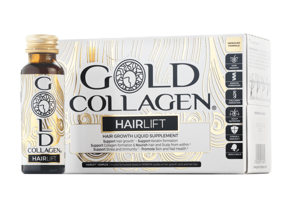 Gold Collagen Hairlift este un supliment alimentar imbogatit cu extract de rucola, keratina hidrolizata si biotina, care sustine ciclul natural al parului si face parul sa arate plin, gros si sanatos.