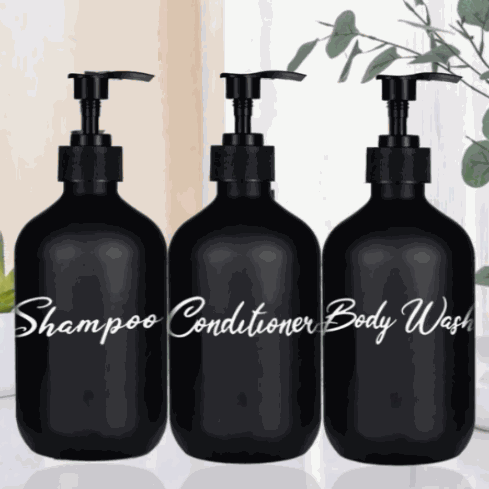 Set 3 recipiente tip dispenser, pentru șampon, balsam și gel de duș 500 ml, culoare negru